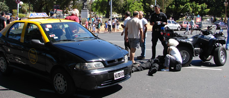 Según declaraciones del conductor del taxi "Yo venía por Libertador y ví que cruzaba un montón de gente corriendo, reduje la velocidad y venía muy atento para no chocar a nadie, pero no vi que de contramano apareció un cuatriciclo que me chocó acá (muestra el guardabarro delantero izquierdo)".