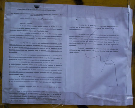 El viernes de la semana pasada apareció pegada, en la valla de protección de la obra en Plaza Emilio Mitre, una fotocopia de la sentencia dictada por el Juez Roberto Gallardo, que levanta la medida cautelar. Hablamos con un director de CRIBA.