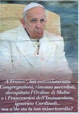 En los afiches se veía una foto de medio cuerpo del Papa, con su rostro adusto, como enojado y sobre su imagen se podía leer: "A France' (Francisco) has intervenido Congregaciones, removido sacerdotes, decapitado la Orden de Malta y a los Franciscanos de la Inmaculada, ignorado cardenales... pero ¿dónde está tu misericordia?".